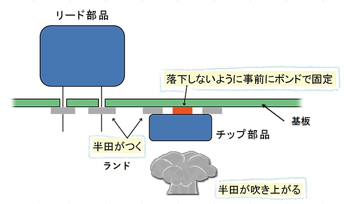 チップ部品は足が無いため、事前にボンドで仮止めされてからはんだされます。