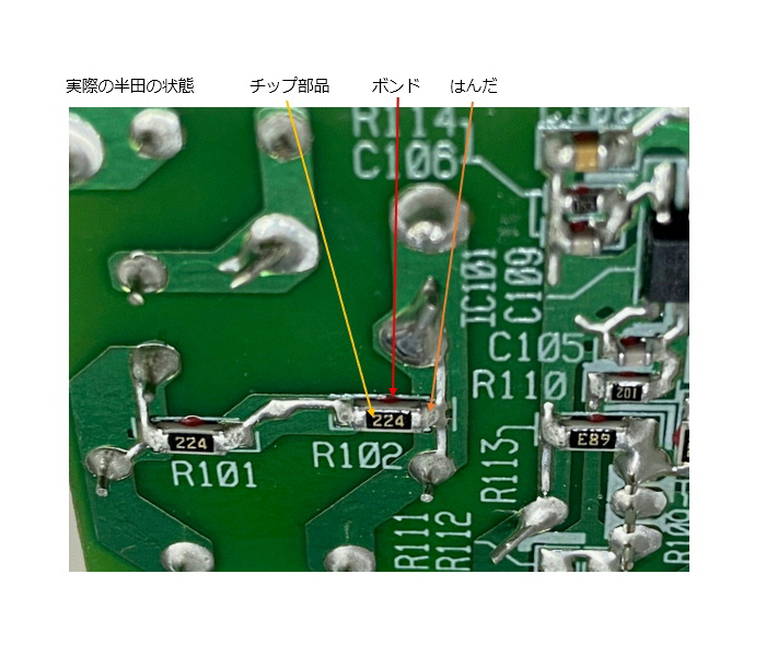 チップ部品は足が無いため、事前にボンドで仮止めされてからはんだされます。