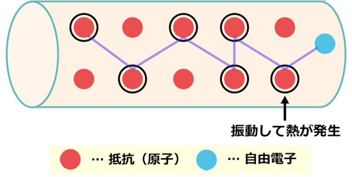 原子は電気の流れを妨げる抵抗となり、そのエネルギーを