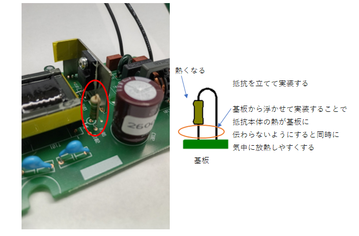 〇抵抗器:基板から浮かせて実装し、基板に熱が伝わらないようにします。