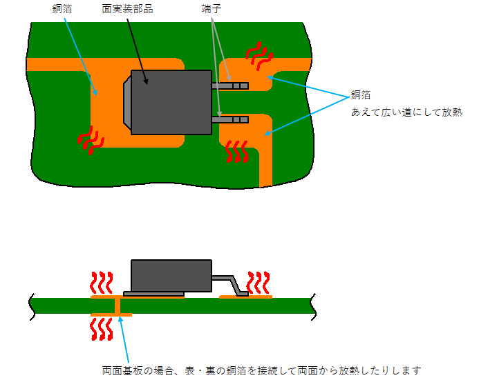 〇面実装部品:基板に貼り付けるので、電気の通り道である銅箔部分の面積を広くして銅箔の表面を放熱板にします。